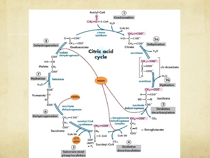 CITRIC ACID: INS AND OUTS ● What goes in: o o o Acetyl-Co. A H 2 O 3 NAD+ 1 FAD 1 GDP ● What comes out: ○ ○ 2 CO 2 3 NADH 1 FADH 2 1 GTP