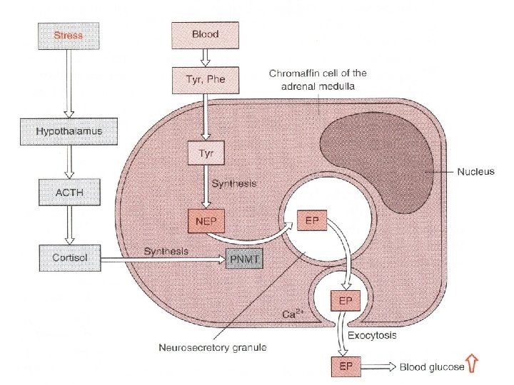 Biosynthesis of catecholamines in the adrenal medulla 1 2 3 4 1. Tyrosine hydroxylase: oxidoreductase, cofactor tetrahydropteridine; inhibition by the catecholamines, tyrosine derivates, and by chelating iron 2. Dopa decarboxylase: cofactor pyridoxal phosphate; inhibitors α-methyldopa 3. Dopamine β-hydroxylase: mixed function oxidase, ascorbate as an electron donor, copper at the active site 4. Phenylethanolamine-N-methyltransferase: the synthesis is induced by glucocorticoid hormones