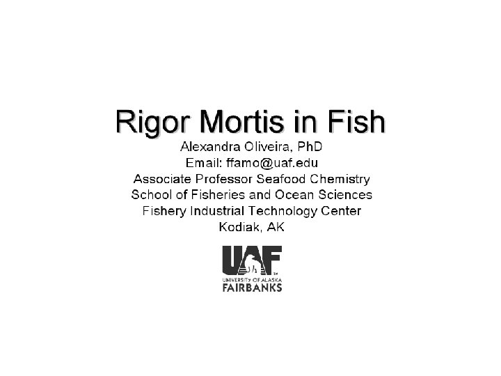 Physical Method of Monitoring Rigor Mortis in Fish (An example) • Rigor Index - Iwamoto dkk. (1987) Yang paling diterima fisik pengukuran untuk memantau kekakuan mortis perkembangan dari waktu ke waktu Sederhana dan cepat Tidak cocok untuk ikan besar Indeks Kombinasi Kekakuan dan teknik lainnya Sensorik evaluasi (analisis taktil dan visual) Tekstur pengukuran (menggunakan instrumen) p. H perkembangan Produk degradasi nukleotida (ATP, dll. . . )