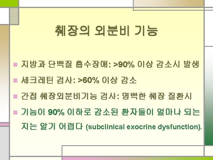 Tests of Pancreatic Exocrine Function n Direct stimulation n Study of intraluminal digestion products n Measurement of fecal pancreatic enzymes