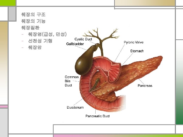 Pancreas Secretion n 1, 500 – 3, 000 ml/day n Isosmotic alkaline (p. H > 8. 0) n 20 enzymes n Zymogens (inactive precursor of proteolytic enzyme) Regulation Hormone Secretin Cholecystokin Optimal p. H for the function of digestive enzymes Autoprotection (protease inhibitor) Nervous system Parasympathetic nervous system -via vagus nerve Release of vasoactive intestinal peptide(VIP)