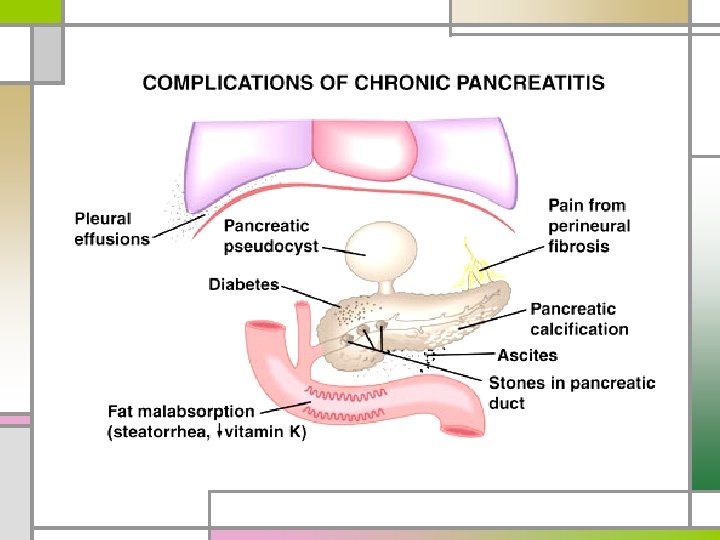 n Pancreas calcification n Alcohol n Severe protein-calorie malnutrition n Hereditary pancreatitis n Post-traumatic pancreatitis n Hyperparathyroidism n Islet cell tumors n Idiopathic chronic pancreatitis Decrease or disappear spontaneously in 1/3 case (dynamic process) Chronic Pancreatitis