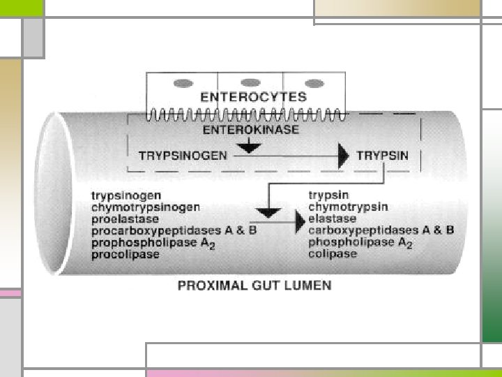 n Amylolytic enzymes – Amylase - starch to oligosaccharides or disaccharide Enzyme Excretion n Lipolytic enzymes - Lipase, phospholipase A, cholesterol-esterase n Proteolytic enzymes - Endopeptidase (trypsinogen, chymotrypsin) Cholecystokinin act on internal peptide bonds of proteins - Exopeptidase (carboxy or aminopeptidase) act on carboxyl-teminal and amino-terminal - Elastase Secreted as inactive precursors