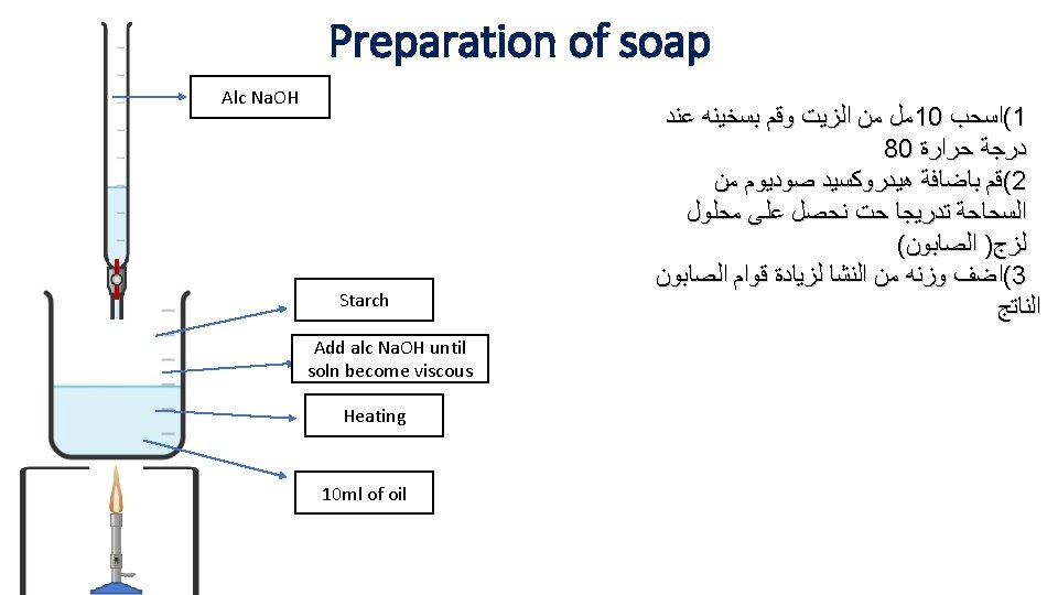 Properties of soap 1) Separation of fatty acids Oily drops on the surface 2) salting out the soap will precipitate Warming . 5 ml conc HCl Na. Cl 5 ml of soap soln R-COONa + HCl 5 ml of soap soln R-COOH + HCl R-COONa Na. Cl