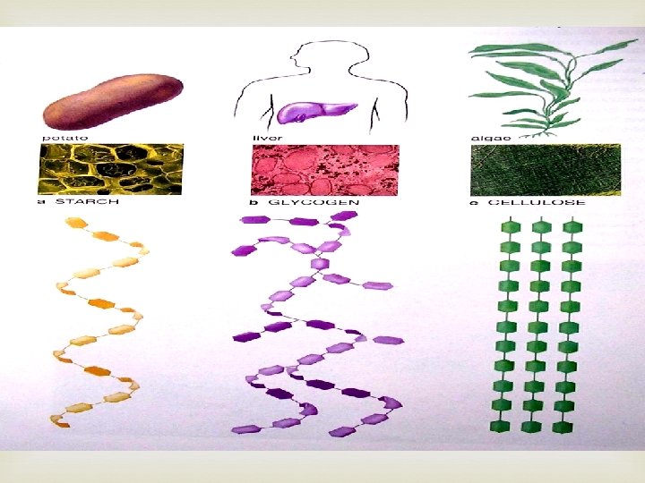 Carbohydrates Made of C, H, and O Usually a 1: 2: 1 ratio Used by living things as their main source of energy Plants and some animals use them for structure Also called “sugars” Two types Monosaccharides – single sugar molecules Polysaccharides – a chain of monosaccharides Monosaccharide Glucose Galactose Fructose Polysaccharide Glycogen Starch Cellulose