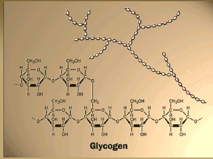 Glycogen n Glycogen is the storage form of sugar in animals. It looks like starch, but with more glucose many branches attached.