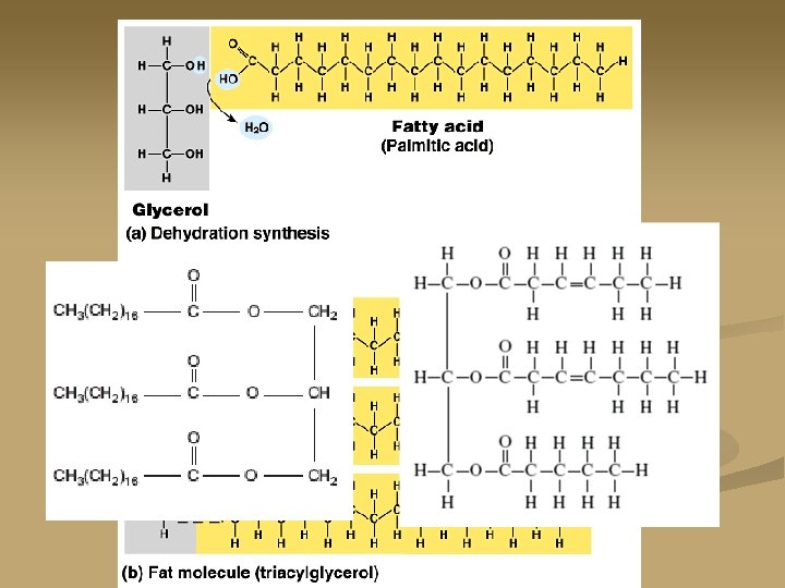 Neutral Fats: n They are produced by dehydration synthesis of one or more fatty acids with a glycerol (an alcohol). monoglyceride: one fatty acid on a glycerol n Diglyceride: two fatty acids on a glycerol n Triglyceride: three fatty acids on a glycerol n