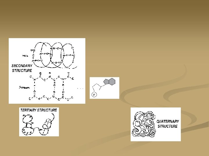 Four levels of protein organization: n Secondary structure: 1. 2. alpha helix: A spring like shape caused by the attraction between H-bonds of every fourth amino acid which causes the linear arrangement to take on other shapes. Beta pleated sheet: