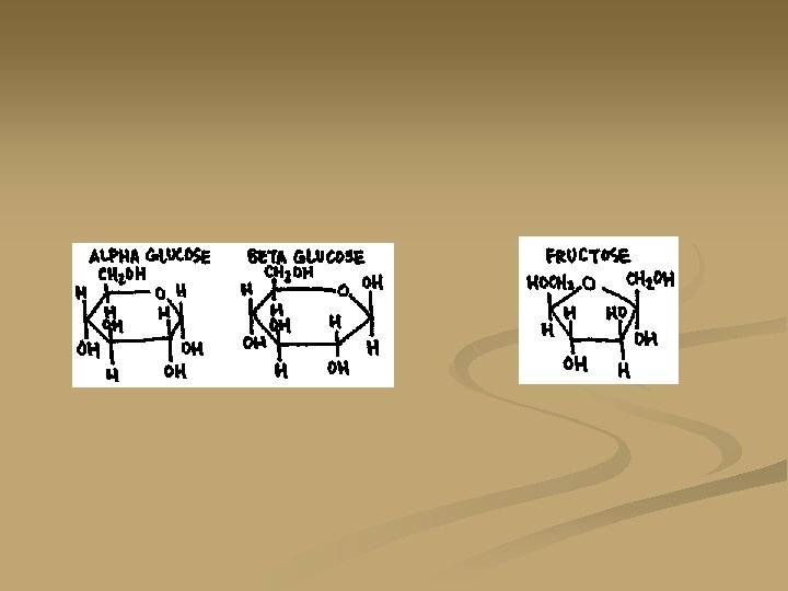 Monosaccharides Fructose: C 6 H 12 O 6 n Four carbon ring n Same chemical formula as glucose but different placement of carbons in the ring. n