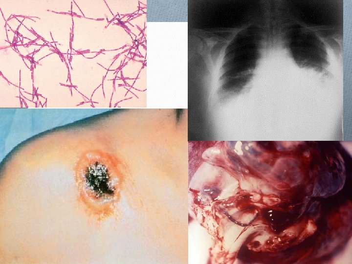 Bacillus anthracis O Also know as ANTHRAX O Spore-forming, rod-shaped bacterium, with a width O O of 1 -1. 2µm and a length of 3 -5µm. Anthrax can be found in 3 forms: 1) Cutaneous: the most common form (95%), causes a localized inflammatory black necrotic lesion 2) Pulmonary: highly fatal and characterized by sudden massive chest edema followed by cardiovascular shock 3) Gastrointestinal: rare but also fatal (causes death to 25%) type results from ingestion of spores