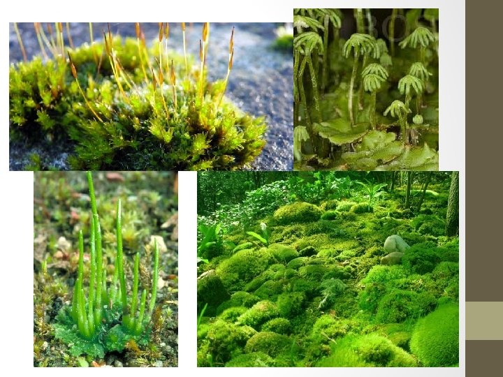 BRYOPHYTES 3 groups: 1. Mosses 2. Liverworts (flattened; liver-shaped) 3. Hornworts (horn-shaped) • Small terrestrial plants • Grow in damp, shady areas • Gametophyte generation = DOMINANT (large and longer-living than sporophyte generation)