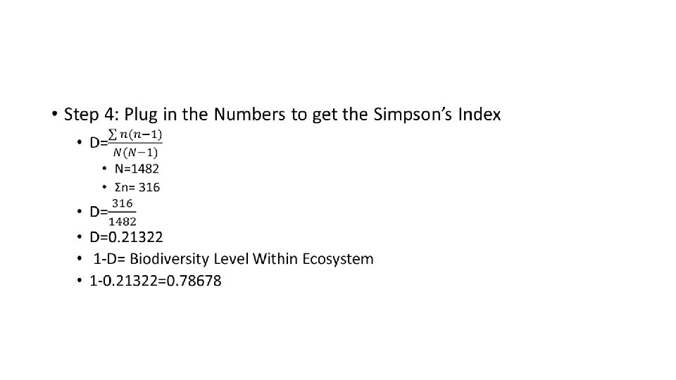 • Step 5: Analysis of Simpson’s Index • Simpson’s Index ranges from 0 -1 • 0 limited biodiversity in an area • 1 high biodiversity in an area • Our number is 0. 7753 • We have a high level of biodiversity within our sample area.