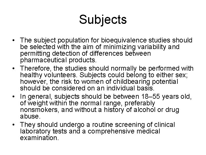 Subjects • The subject population for bioequivalence studies should be selected with the aim of minimizing variability and permitting detection of differences between pharmaceutical products. • Therefore, the studies should normally be performed with healthy volunteers. Subjects could belong to either sex; however, the risk to women of childbearing potential should be considered on an individual basis. • In general, subjects should be between 18– 55 years old, of weight within the normal range, preferably nonsmokers, and without a history of alcohol or drug abuse. • They should undergo a routine screening of clinical laboratory tests and a comprehensive medical examination.
