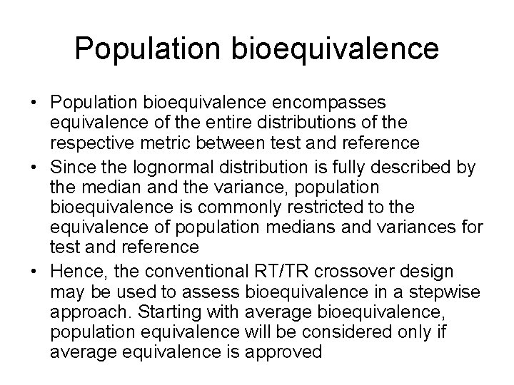 Population bioequivalence • Population bioequivalence encompasses equivalence of the entire distributions of the respective metric between test and reference • Since the lognormal distribution is fully described by the median and the variance, population bioequivalence is commonly restricted to the equivalence of population medians and variances for test and reference • Hence, the conventional RT/TR crossover design may be used to assess bioequivalence in a stepwise approach. Starting with average bioequivalence, population equivalence will be considered only if average equivalence is approved