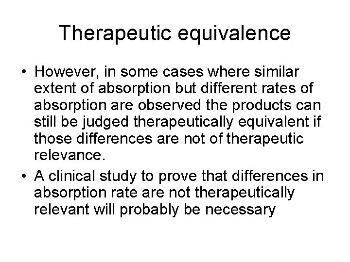 Therapeutic equivalence • However, in some cases where similar extent of absorption but different rates of absorption are observed the products can still be judged therapeutically equivalent if those differences are not of therapeutic relevance. • A clinical study to prove that differences in absorption rate are not therapeutically relevant will probably be necessary