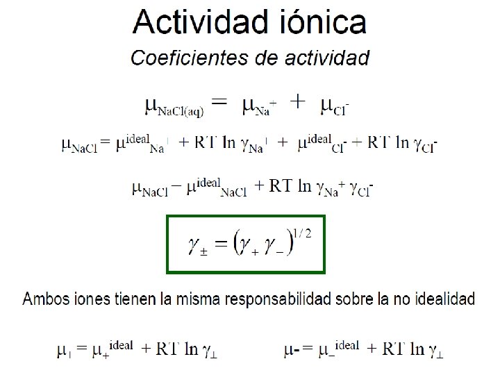 Actividad iónica La existencia de un ión implica la existencia de un contraión El potencial químico de una sal en solución (totalmente disociada) está dado por la suma de los potenciales químicos de los dos iones µNa. Cl(aq) = µNa + (aq) +µCl – (aq)