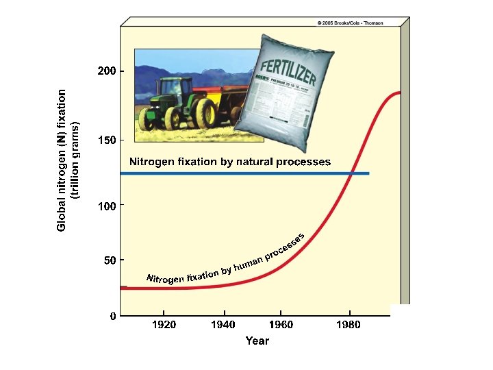 HUMAN IMPACTS ON NITROGEN CYCLE • Remove nitrogen from Earth’s crust when we mine for nitrogen-containing minerals for fertilizers (ammonium nitrate (NH 4 NO 3). • Deplete nitrogen from topsoil by harvesting nitrogenrich crops (soybeans, alfalfa). • Leach water-soluble NO 3 ions from soil through irrigation. • Remove nitrogen from topsoil when we burn grasslands and clear forests before planting crops while releasing NOx into atmosphere.