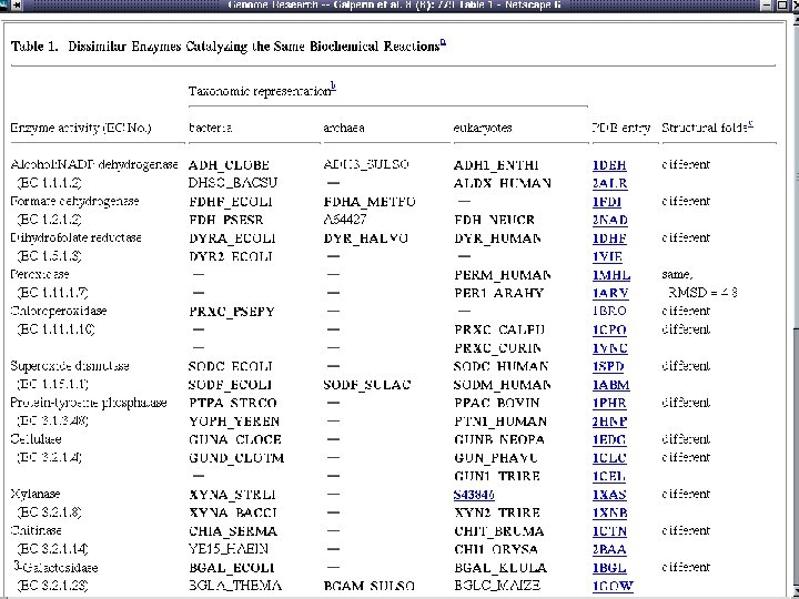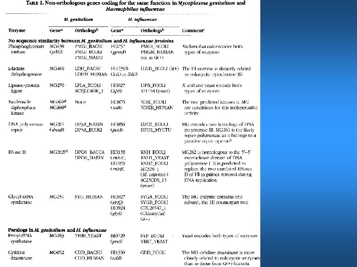 Non-orthologous gene displacement/analogous proteins Not specific to the “genome” age, but research into this topic has increased dramatically with the availability of complete genomes. (people would encounter “missing links”, and start hypothesizing about what could fill up this gap) First systematic analysis on M. genitalium (Koonin et al. , Trends Genet. 1997)