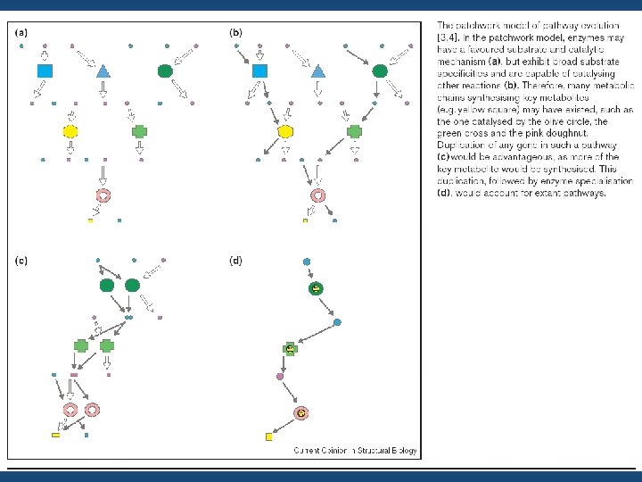 Structural assignments and sequence comparisons were used to show that 213 domain families constitute approximately 90% of the enzymes in the smallmolecule metabolic pathways. Catalytic or cofactor-binding properties between family members are often conserved, while recognition of the main substrate with change in catalytic mechanism is only observed in a few cases of consecutive enzymes in a pathway. Recruitment of domains across pathways is very common, but there is little regularity in the pattern of domains in metabolic pathways. This is analogous to a mosaic in which a stone of a certain colour is selected to fill a position in the picture. (Teichmann et al. , 2001) Pathway evolution operates mainly by recruitment, not by Horowitz’ retrograde evolution. (notice that this is not so surprising, given what we learned on day 2: Substrate specificities are relatively volatile aspects of the enzyme evolution, catalytic function is much better conserved the “conservation of substrate binding, evolution of catalytic function” argument is not really what one encounters in present day evolution This does not necessarily support the Jensen theory of substrate ambiguity.