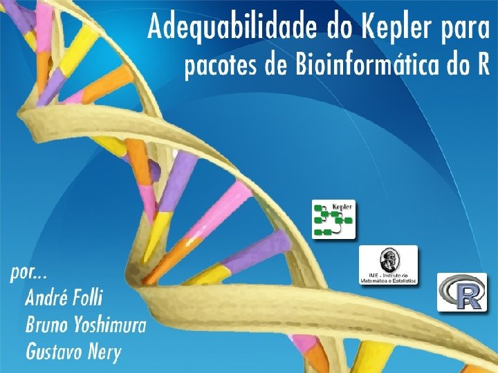 Conclusão É viável a utilização do Kepler para bioinformática? Tendo em vista que a análise e processamento de dados de bioinformática requer muito recurso de hardware, esta solução seria muito ineficiente. Uma idéia por trás da programação visual é unir programas e dados heterogêneos, que não foram criados com a intenção de serem rodados por plataformas de programação visual. Seria possível programar em R de tal forma que fosse possível utilizar o Kepler, mas esta não é a solução para o nosso problema pois os pacotes de análise em R já foram criados.
