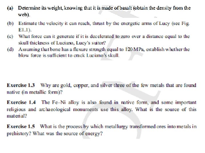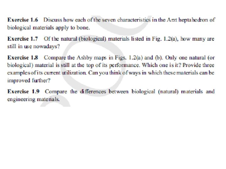 Summary n n Early humans used exclusively natural materials, the majority of which were biological: wood, bone, hide, tendons and ligaments, horns, and antlers. The earliest vestiges of industrial-scale production of copper are from Jordan. This marked the beginning of the use of metals and alloys as a major class of materials. Biological materials have seven unique and defining features: (i) self -assembly; (ii) self-healing capability; (iii) evolution and environmental constraints; (iv) hydration; (v) mild synthesis conditions; (vi) functionality; (vii) hierarchy. Although our synthetic materials have properties that far exceed those of biological materials, the latter have ingenious designs that evolved through millions of years. Thus, we are developing a new class of bioinspired materials that apply the internal design principles of biological materials but use synthetic synthesis and processing methods.