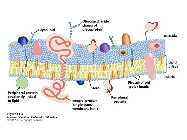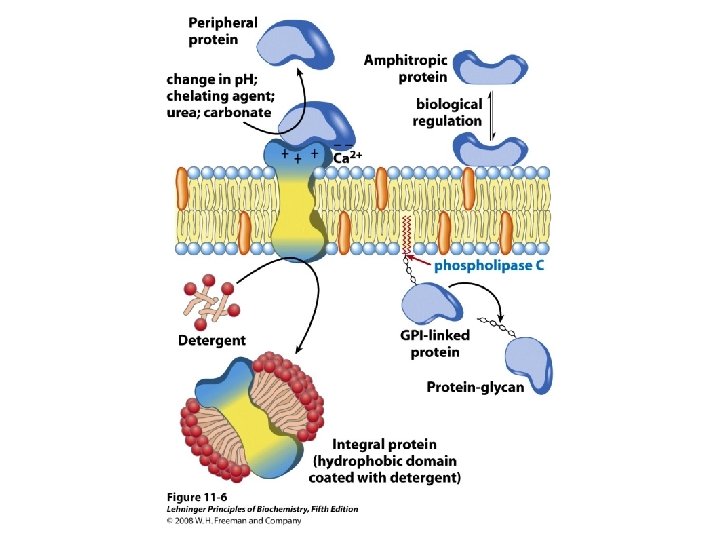Membrane proteins Integral (intrinsic) proteins: Firmly associated, removable only by agents that interfere with hydrophobic interactions such as detergents, organic solvents or denaturants. Peripheral (extrinsic) proteins Associated through electrostatic interactions & hydrogen bonding with the hydrophilic domains of integral proteins and with the polar head groups of membrane treatments lipids, readily removable by mild
