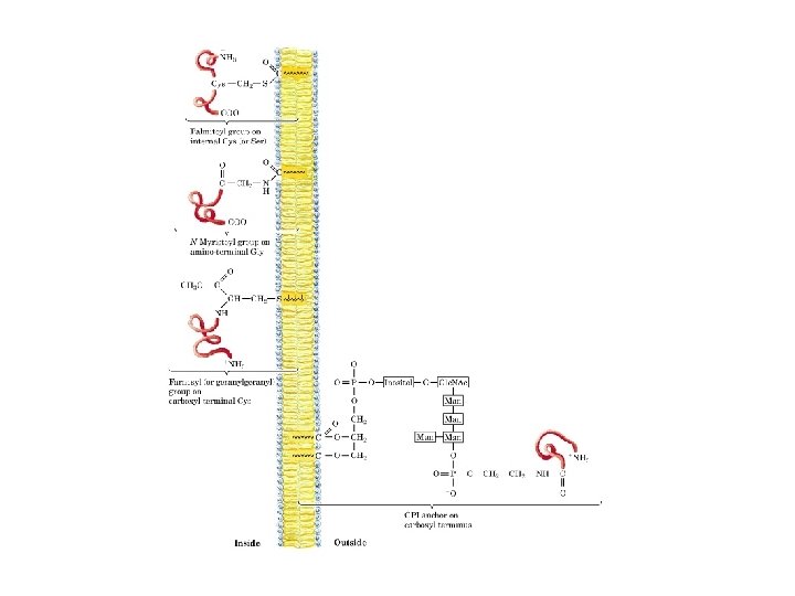 Types I & II have only one transmembrane helix, the amino terminal domain is outside the cell in type I proteins and inside in type II. Type III proteins have multiple transmembrane helices in a single polypeptide. Type IV proteins have several transmembrane domains from different polypeptide chains to form a channel through the membrane Type V proteins are held to the bilayer primarily by covalently linked lipid Type VI proteins have both transmembrane helices and lipid (GPI) anchors.