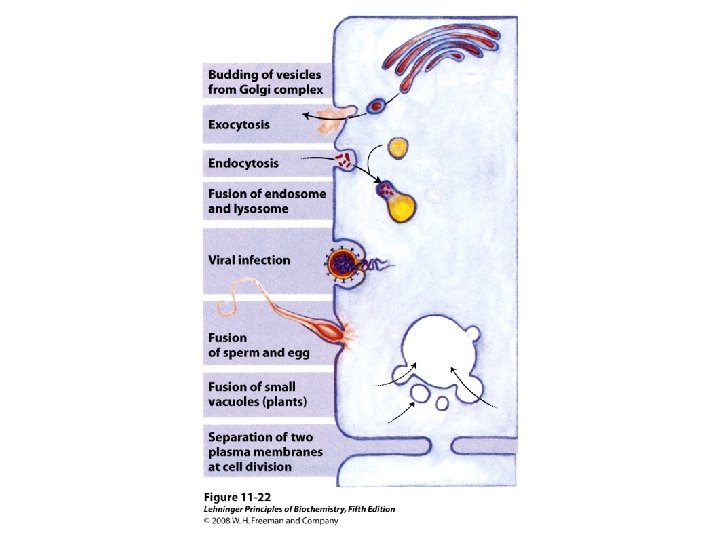 Membrane fusion Specific fusion of two membranes requires: a) They recognize each other b) Their surfaces become closely apposed, which requires the removal of water molecules normally associated with the polar head groups of lipids c) Their bilayer structures become locally disrupted d) The two bilayers fuse to form a single continuous bilayer e) The fusion process is triggered at the appropriate time or in response to a specific signal