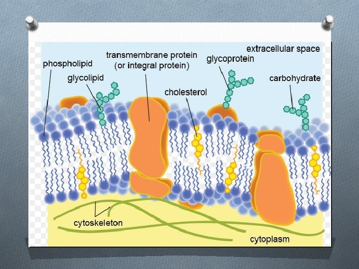 Membrane Composition O Mostly made of phospholipids O Different types of proteins as well O Integral membrane proteins = proteins that are embedded (stuck in) the membrane O Transmembrane proteins = integral proteins that extend completely through the membrane (stick out both sides)