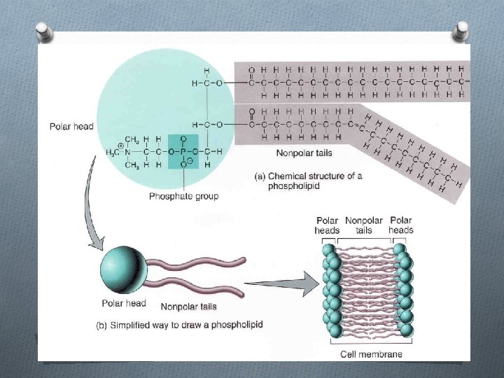Phospholipids Bilayers O Phospholipids are the main structural component of the cell membrane O Made up of a glycerol, phosphate group, and two fatty acids O Amphipathic = one side is hydrophobic and one side is hydrophilic O Head is polar & hydrophilic (water loving) O Tails are nonpolar & hydrophobic (water fearing)