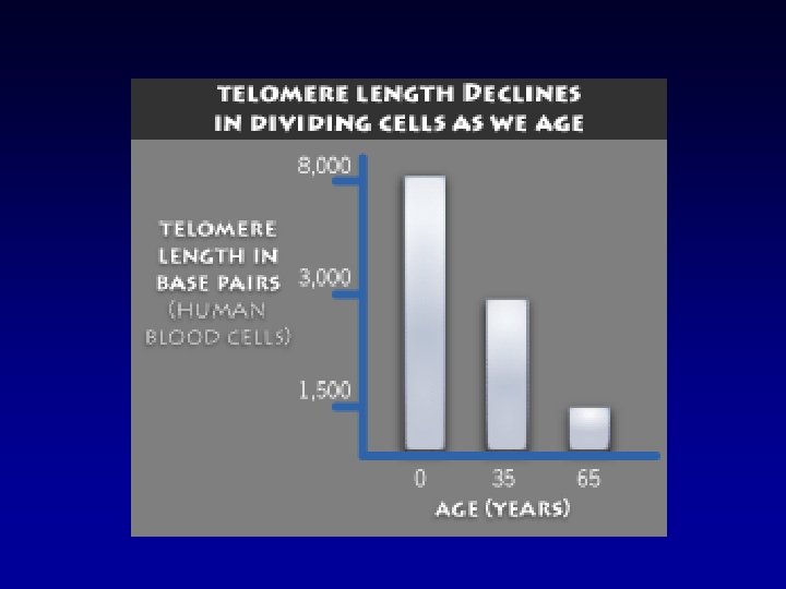 Extension of Wear & Tear: Why only 50 PDs? Answer: The Telomere Hypothesis of Aging A. M. Olovnikov, 1996 • Telomeres are sequences of nucleic acid • End pieces of DNA (the tail of DNA) • Every time cells divides, telomeres shorten • Once the telomeres become too short, cell division slows and finally ceases and the cell will die telomeres are lost with age in normal dividing cells, cancer cells escape mortality by activating the enzyme telomerase.