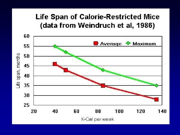 Rate of Living Theory Updated & Refined: Caloric Restriction Theory of Longevity 1937 - Clive Mc. Cay, Cornell University - 33% CR (rats) 50% increase in max lifespan • Yeast (increases by 25% when glucose level in culture reduced from 2% to 0. 5%) • Mosquitoes • Flies • Protozoans • Roundworms • Spiders • fish late 1980 s - start three studies with monkeys NIA - Baltimore - 160 monkeys (squirrel monkeys and rhesus monkeys) Univ. Maryland - Baltimore - 27 monkeys Univ. Wisconsin - 76 monkeys approx. 30% CR + supplements