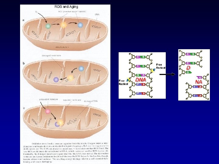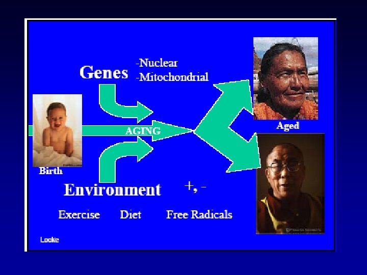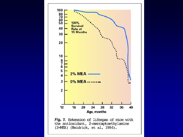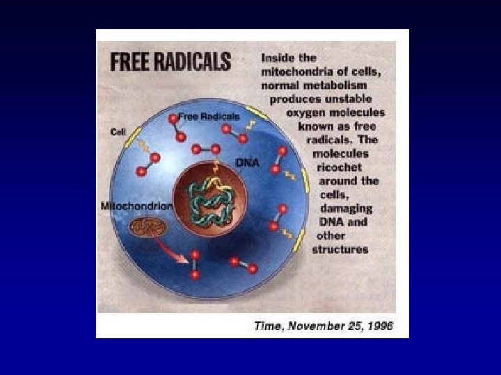 Free Radical Theory of Aging (1954) Denham Harman, Ph. D, M. D, • Aging is a result of oxidative damage caused by free radicals generated by the metabolic system • Free radicals are unstable organic molecules that appear as a byproduct of oxygen metabolism in cells • Free radicals are any number of chemical species that are highly reactive because they possess an odd number of electrons and seek to combine with other molecules to pair off their free electron • Damage: lipids, protein, carbohydrates, nucleic acids, various other cell components • Supported by caloric restriction studies: caloric restriction extends life expectancy by