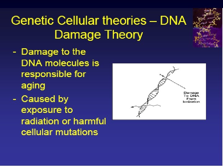 Autoimmune Theory: • immune system begins to decline after adolescence • vulnerability to disease and a sluggish response to some tumor cells • system so weakened that it can no longer distinguish between the body’s own and foreign tissues, i. e. the body may begin to attack itself. Cross-Linkage Theory: • Connective tissue looses elasticity with age (wrinkles, cataracts) • Loss of elasticity results from accumulation of cross-linking compounds that cause the collagen to become stiff • Some of this cross-linking may be caused by free radicals