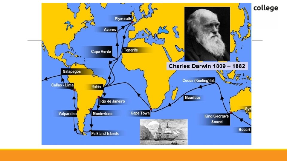 De evolutietheorie • De evolutietheorie is de natuurwetenschappelijke verklaring voor de evolutie van het leven (NIET OVER HET ONTSTAAN VAN LEVEN) en aan de verscheidenheid van de soorten op Aarde. • In 1859 publiceerde Charles Darwin zijn theorie in het boek: On the origin of species
