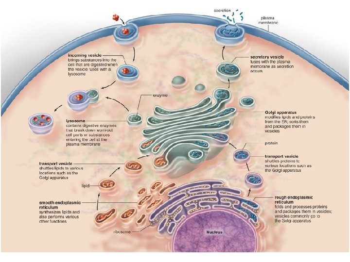 Endoplasmic Reticulum • Rough ER – Processing and modification of proteins – Proteins are exported – Proteins move inside the ER to Golgi Apparatus