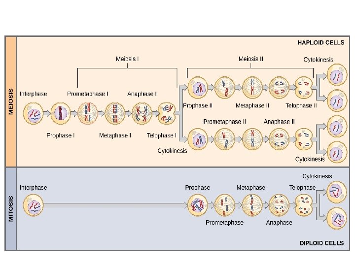 11. 1 THE PROCESS OF MEIOSIS Comparing Meiosis and Mitosis • Both processes divide the nucleus in eukaryotic cells • Mitosis is a single division; meiosis is two successive divisions • Homologous chromosomes pair to form tetrads in meiosis but not in mitosis • In meiosis, crossing over between sister chromatids and independent assortment of chromosomes in anaphase I create genetic variation. Mitosis produces genetically identical clones. • Meiosis reduces the number of chromosome (ploidy: 2 n → 1 n), mitosis does not