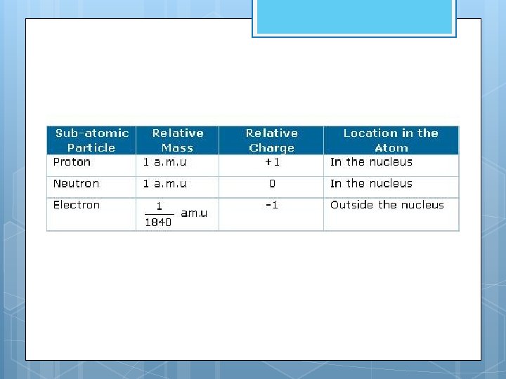 Protons and neutrons are both located in the nucleus and have about the same mass. They are held together by strong charges - Protons have a positive charge (+) - Neutrons have no charge Electrons (e-) have a negative (-) charge, and 1/1840 the mass of a proton. Electrons are constantly moving and are located in the area surrounding the nucleus The (-) charges of the electrons are attracted to the (+) charge of protons, to balance the atom