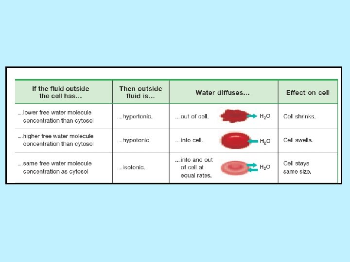 • Isotonic Solution: when the concentration of solutes outside and inside the cell are equal. Water diffuses into and out of the cell at equal rates. No net movement of water.