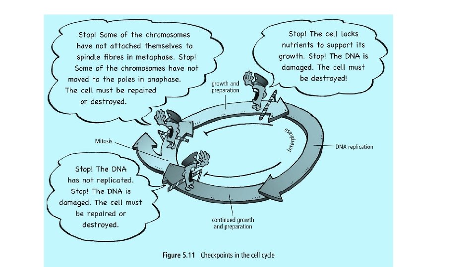Checkpoints in the Cell Cycle • Proteins in the cell check the viability of the cell at certain points in the cell cycle. This information is directed to the nucleus, which decides whether or not the cell will divide. • Cells will not divide if: • 1)There are not enough nutrients to support growth • 2)DNA has not been replicated • 3)DNA has been damaged