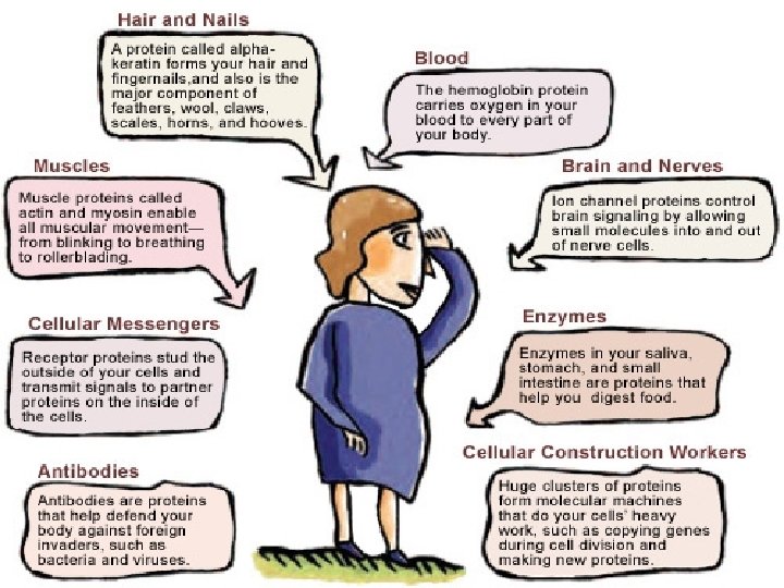 Protein Structure & Function in the Body • • • Involved in virtually all cell functions Each protein has a specific role. Constructed from 20 types of amino acids Have a distinct 3 -D shape (Lock & Key Model) If shape is altered (Denatured), it won’t function Proteins build many structures in our bodies…