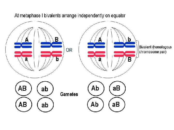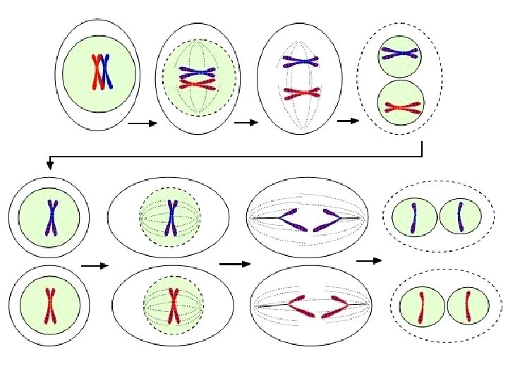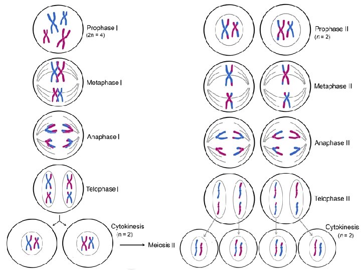 (8) Meiosis-2: 1. Pairs of sister chromatids line up. 2. Pairs of sister chromatids separate using the “Law of Segregation” and the “Law of Independent Assortment”. 3. Cells divide, resulting in 4 cells.
