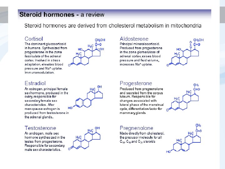Natural ligands of NR • Small, lipid-soluble molecules – Diffuse through plasma and nuclear membranes and interact directly with the transcription factors they control. – STEROID HORMONES: • • sex steroids (estrogen, progesterone, testosterone) corticosteroids (glucocorticoids and mineralcorticoids) – OTHER HORMONES and ligands Thyroid hormone, vitamin D 3, retinoic acid, ligands of Ah. R – Small molecules - gases e. g. NO (signaling for immune reactions)