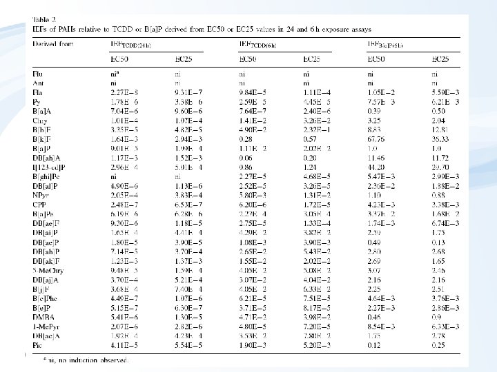 Comparing toxicity of compounds Application in Risk Assessment • Quantification of effects (EC 50) • Comparison with the effect of reference toxicant (2, 3, 7, 8 -TCDD) • relative potencies (REPs) to TCDD (= in vitro “Toxic Equivalency Factors” ~ TEFs) Ah. R-mediated activity (%TCDD-max) 120 TCDD: PAH: TCDD 4´-OH-PCB 79 B[a]P 4´-OH-PCB 3 B[e]P 100 Relative Potency (REP) = Induction Equivalency Factor IEF = IC 50 / IEC 50 80 60 40 REP interpretation: How many times is the compound "weaker" inducer than TCDD ? IEC 50 = 2 m. M 20 IC 50 = 10 p. M 0 1. E-07 IC 50 IEC 50 1. E-04 1. E-01 concentration ( m. M) 1. E+02