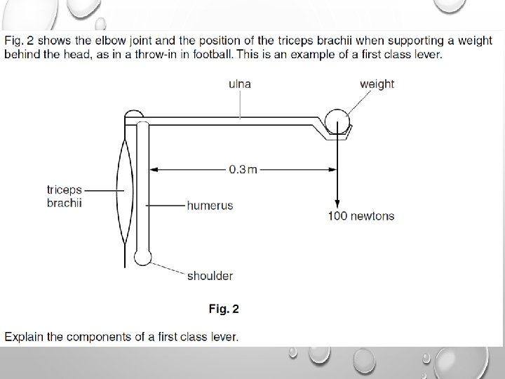 Component Location Diagram Example/ bicep curl up Lever Bone Line Radius/ ulna Fulcrum Joint Triangle Elbow Effort Muscular force Arrow E Force created by bicep brachii Load Weight Arrow L Weight of forearm/ weight