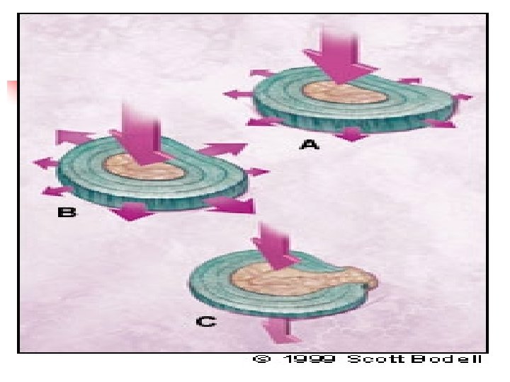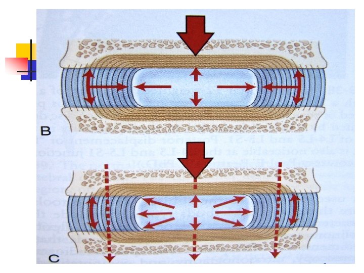 Theory of weight bearing n n n Nucleus pulpous imbibes water Develops internal pressure Pressure exerted in all directions n Lateral forces n n Superiorly and inferiorly directed forces n n Against annulus Against end plates Increases stiffness n Of end plate and annulus fibrosus