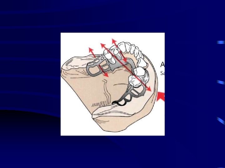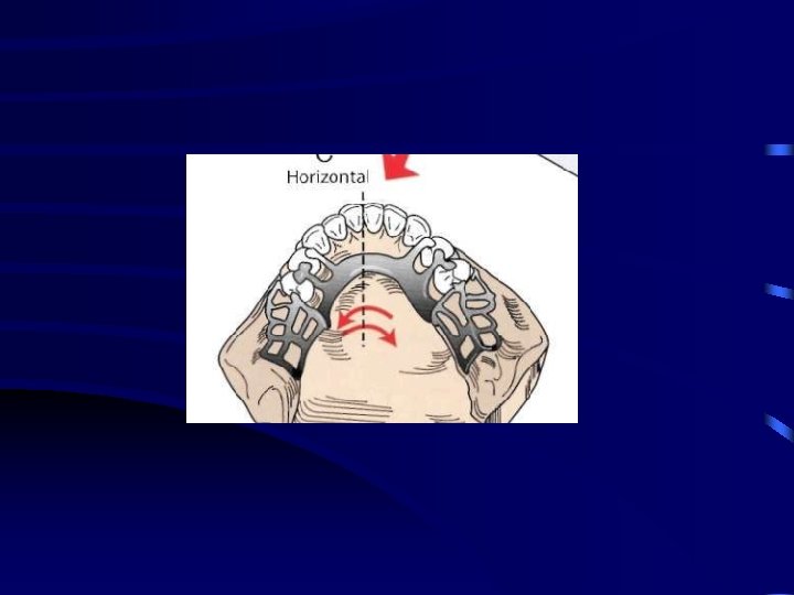 This movement is resisted primarily by the rigidity of the major and minor connectors and their ability to resist torque. • If the connectors are not rigid or if a stress-breaker – this rotation about a longitudinal axis either applies undue stress to the sides of the supporting ridge – horizontal shifting of the denture base.