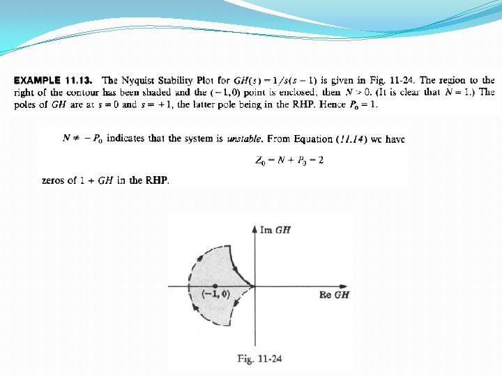 Problem-8: Repeat example-7 and check the stability of the system. • The region to the right of the contour has been shaded. • Clearly, the (-1, 0) point is not in the shaded region; therefore it is not enclosed by the contour and so N ≤ 0. • The poles of GH(s) are at s = 0 and s = -1, neither of which are in the righthand-plane RHP; hence Po = 0. Thus N = -Po = 0, and the system is absolutely stable
