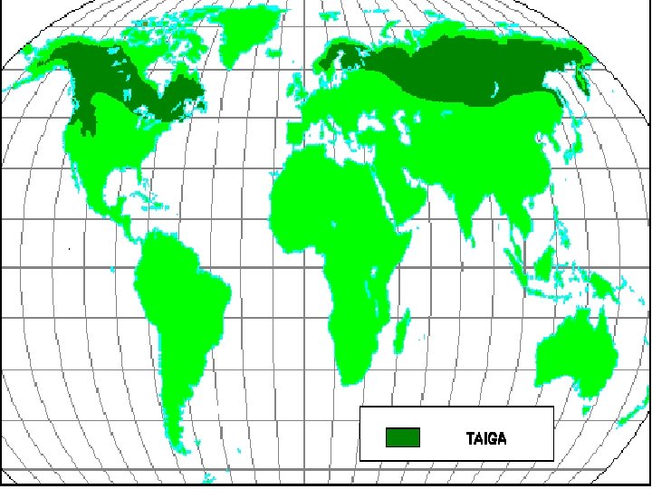 TAIGA • Also known as the boreal or coniferous forest • Stretches across N. America and Eurasia (largest biome) • Not found in the Southern Hemisphere • Winters extremely cold & severe; receives little precipitation (mostly in summer) • Has patchy permafrost under the • Not very fertile, young & immature, soil acidic (pine needle) • Plants: mainly evergreen trees (world’s leading source of • Animals: many insects, few amphibians & reptiles, many mammals wood)