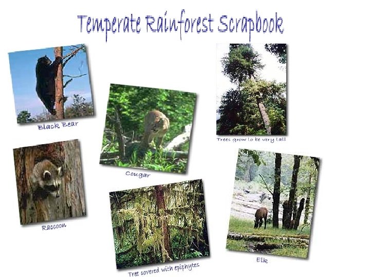 Temperate Rain Forest • Close to coast; temperature fluctuations small; winters mild & summers cool • High annual precipitation (60”-120”/yr) • Plants: lg. evergreen trees (hemlock, fir, cedar, spruce); epiphytes, mosses, lichens • Animals: lg. variety of mammals, birds, reptiles, amphibians, insects • Locations: Pacific NW (US & Canada); SE Australia and southern S. America • Soil richer than tropical rain forests (don’t such up as much nutrients because less diverse)